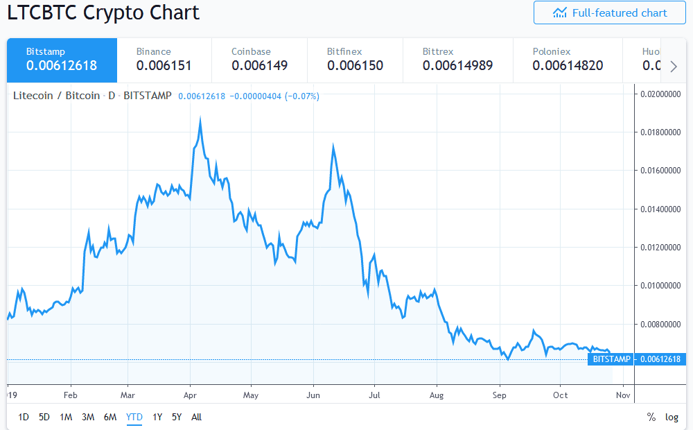 Смертельное пике хэшрейта Litecoin — только одна из целой серии проблем для популярного альткоина. Несмотря на заметные достижения, такие как Litecoin Lightning Network и атомарные свопы, общая привлекательность LTC не получила существенного увеличения, что видно на графике цены, приведенном ниже.