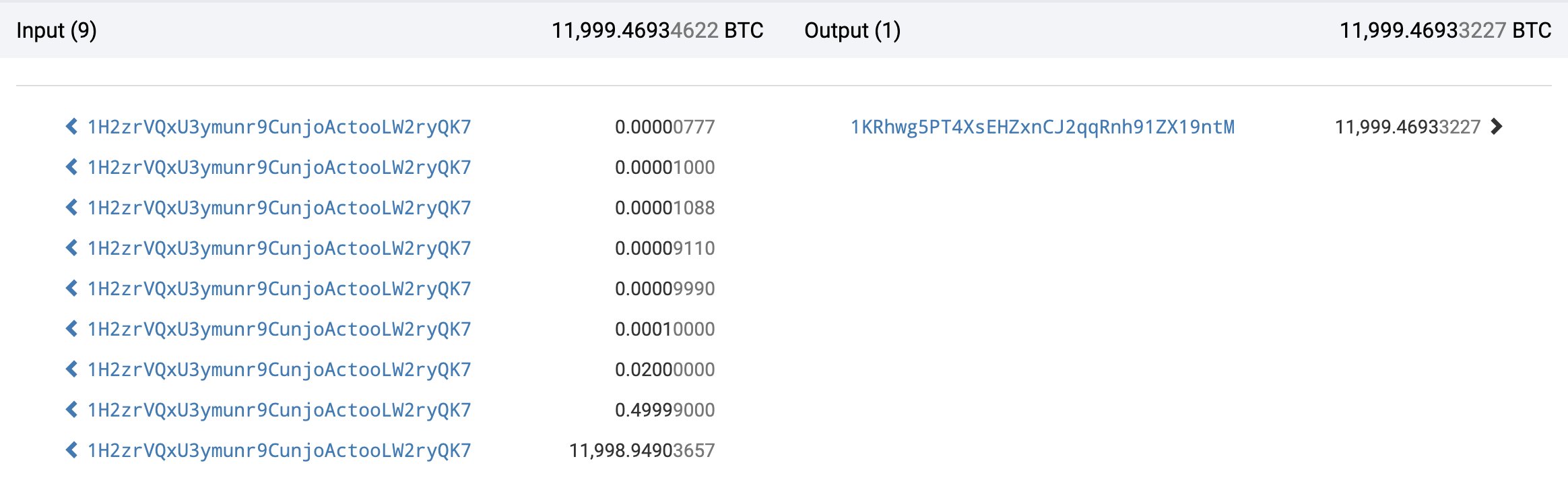 Кошельки также объединяют результаты предыдущих транзакций, перемещая UTXO в один новый адрес. Чиачи Ву пишет: «20k+ BTC перемещены со связанных с PlusToken адресов на новые, которые выглядят как холодные кошельки», и показывает: