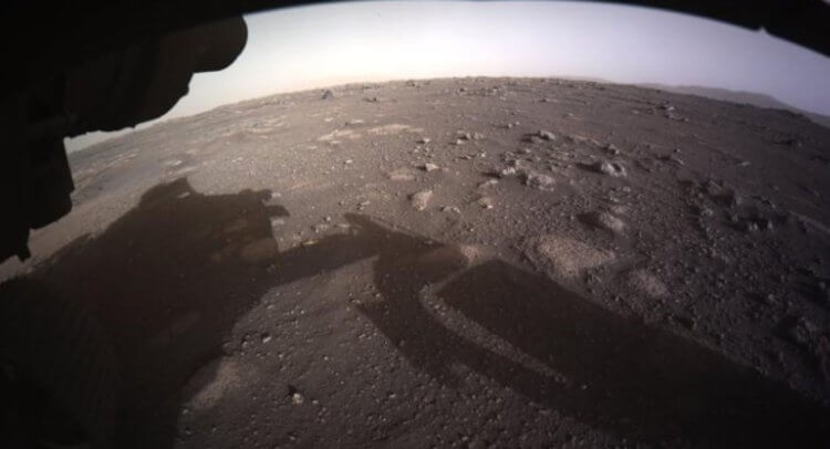 Марсоход Perseverance опустился на поверхность Красной планеты ночью 18 февраля. Посадка произошла в автоматическом режиме и передача информации заняла 11 минут, так что сотрудники NASA да и весь мир в целом узнали об успешном прибытии не сразу. Для спуска Perseverance на поверхность планеты использовалась тормозная система «Небесный кран». Это тот самый аппарат с двигателями, который аккуратно опустил марсоход при помощи нейлоновых шнурков. Во время спуска он сделал снимок, на котором видна верхняя часть аппарата Perseverance.
