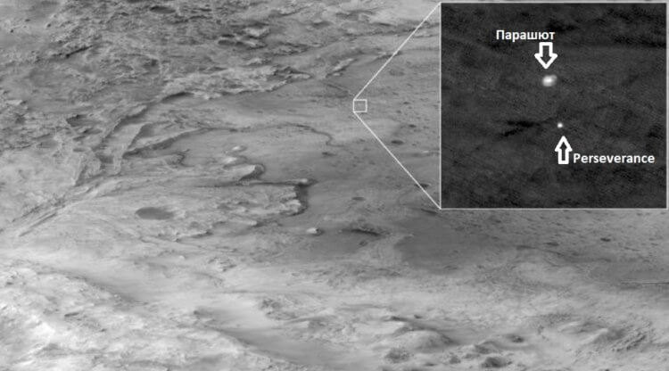 За спуском марсохода Perseverance также следила орбитальная станция Mars Reconnaissance Orbiter. Она была запущена на орбиту Марса в 2006 году и до сих пор работает. Благодаря ему, в 2019 году было выяснено, что под поверхностью северного полюса Марса есть большой тайник с запасами водного льда. Он находится на глубине примерно 1,5 километров — подробнее о нем можно почитать по этой ссылке. На одной из последних сделанных станцией кадров можно разглядеть, как марсоход Perseverance опускается на поверхность планеты на парашюте. Приглядитесь и вы все увидите.
