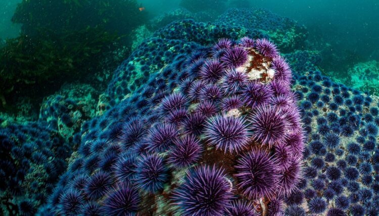 Тихоокеанские пурпурные морские ежи покрывают все морское дно у побережья Монтерея, Калифорния