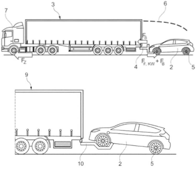 О необычном способе зарядки электромобилей было рассказано в издании The Drive. В базе Ведомства по патентам и товарным знакам USPTO был найден документ, где описывается принцип зарядки электромобилей на ходу за счет грузовиков. Согласно ему, автомобиль сможет крепиться к задней части грузовой машины как через трос, так и при помощи жесткой сцепки. Чтобы транспортные средства могли сцепляться на ходу, электромобили предлагается оснастить системой стыковки, которая сама оценивает расстояние до грузовика и приближает автомобиль к нему вплоть до самого контакта. Примечательно, что при жесткой сцепке передние колеса электромобиля будут подняты грузовиком при помощи специальной площадки.