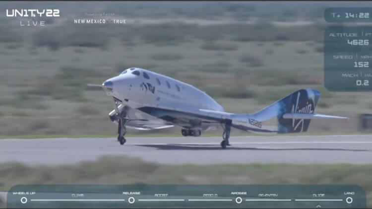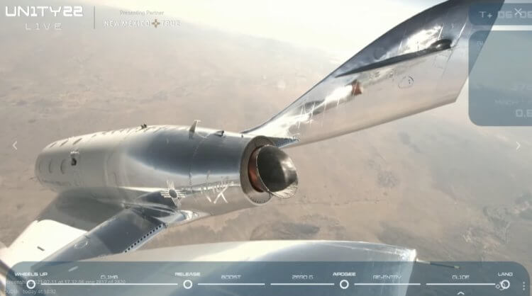 Как и предполагалось, самолет VMS Eve поднял самолет на высоту более 20 километров. При этом скорость его полета достигала 600 километров в час. После достижения нужной высоты носитель и космический корабль отделились друг от друга. Аппарат VSS Unity с людьми на борту включил свои двигатели и достиг высоты более 80 километров — все прошло так, как все и задумывалось. При этом скорость полета превышала 1500 километров в час.