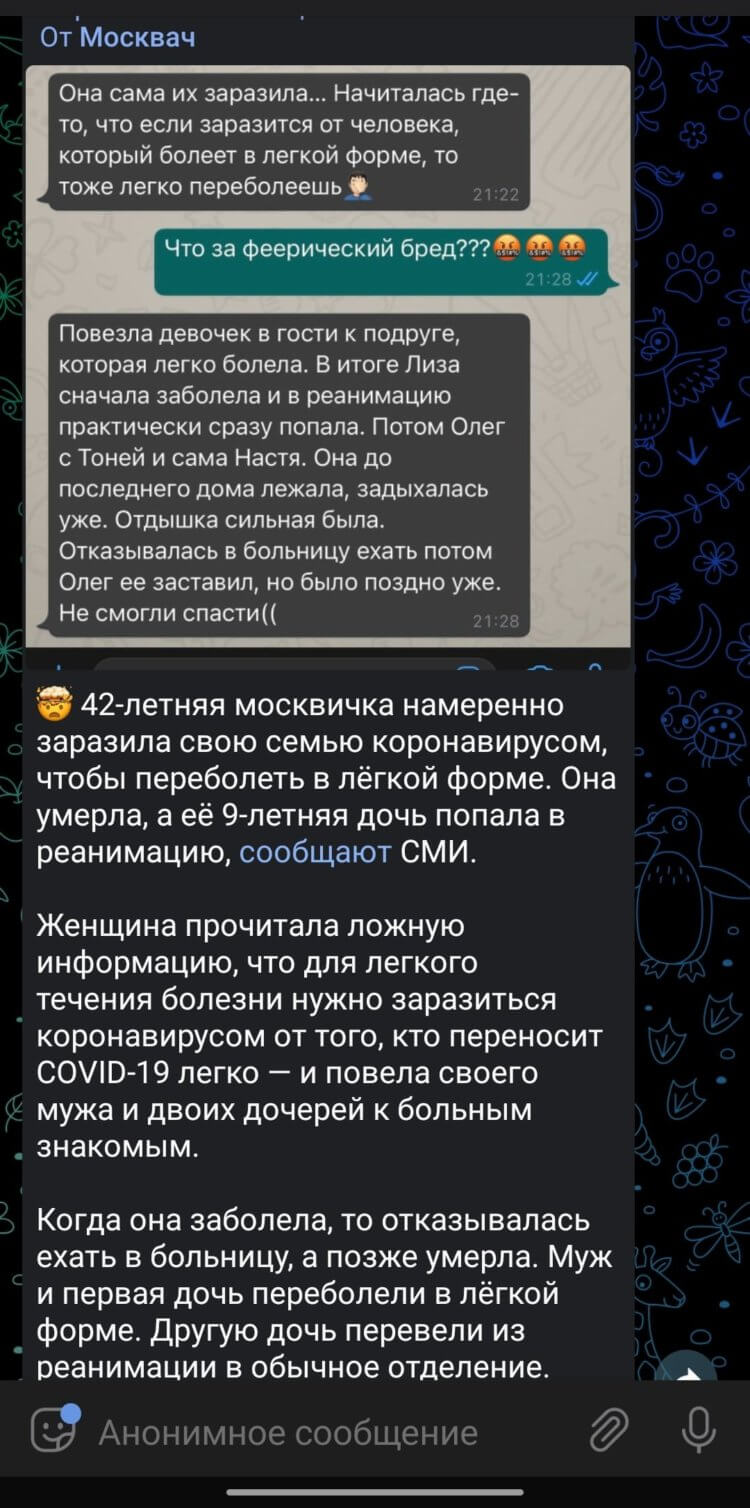 Недавно я наткнулась на историю о 42-летней москвичке, которая где-то прочитала, что чтобы перенести COVID-19 в легкой форме, нужно заразиться от человека, который легко переносит болезнь. Женщина отвезла двоих дочерей и мужа в гости к больной подруге. В результате она умерла, а одна из ее дочерей попала в реанимацию.