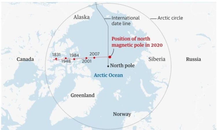 Северный магнитный полюс уже преодолел 200-мильную зону Канады и движется в сторону российского арктического побережья. Через 50 лет он достигнет архипелага Северная Земля. А если будет ускоряться, то появится здесь еще раньше.