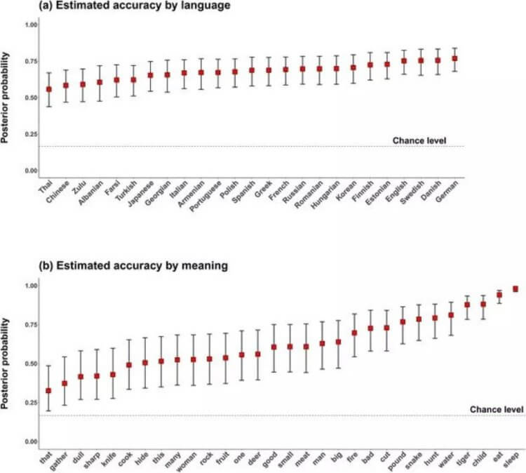 К удивлению исследователей, испытуемые распознали суть замаскированных слов с точностью 64,6%. Звуковое описание слова «спать» поняли почти все люди (98,6% испытуемых) — угадывание действий в целом давалось им легче. В конечном итоге ученые пришли к выводу, что у всех языков мира есть своя основа в виде различных звуков.