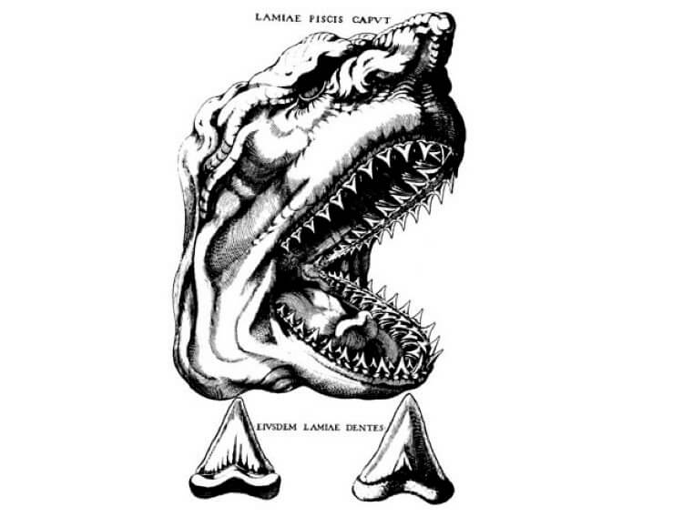 Первые упоминания мегалодонов относятся к эпохе Возрождения. В документах тех времен можно найти сообщения об обнаружении больших треугольных зубов. Изначально люди считали, что имеют дело с окаменевшими зубами древних драконов или других чудовищ. Но в 1667 году датский геолог Нильс Стенсен (Niels Stensen) выяснил, что это — зубы древних акул. Именно он стал автором первого в истории изображения мегалодона. И рисунок оказался очень близким к современному представлению древних акул.