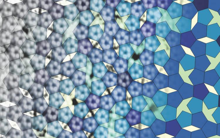 Примерно в это же время Пол Стейнхардт, физик-теоретик из Принстонского университета в Нью-Джерси, и его коллеги предположили возможность существования неповторяющихся трехмерных структур. Они имели ту же симметрию, что и икосаэдр, но были собраны из строительных блоков нескольких различных типов, которые никогда не повторялись. Физик-математик Роджер Пенроуз из Оксфордского университета и другие исследователи ранее обнаружили аналогичные закономерности в двух измерениях, которые называются мозайкой Пенроуза.