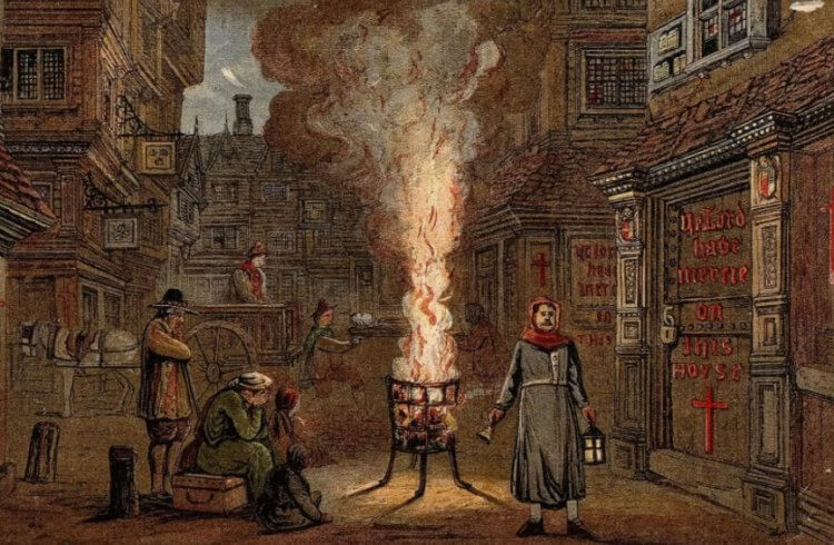 Чума в Лондоне в представлении художника. Обратите внимание на крест на двери дома — он предупреждал, что внутри есть зараженный человек