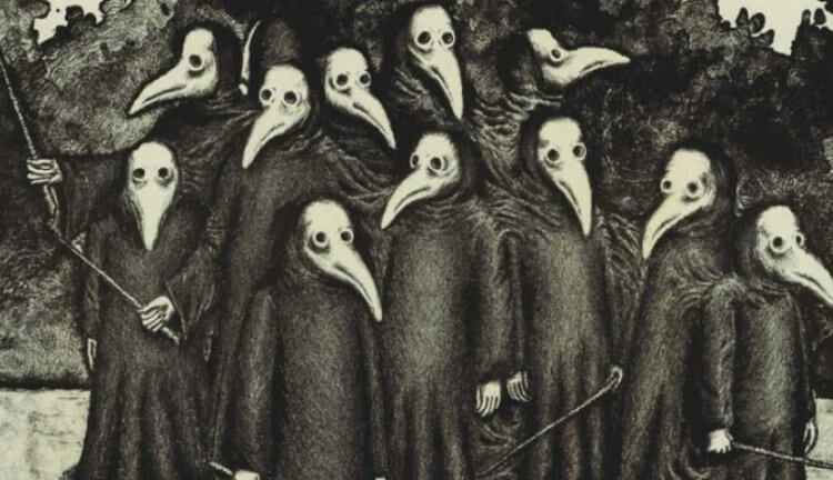На рисунке изображены чумные доктора. Они носили вытянутые маски, которые якобы защищали их от «болезнетворного запаха»