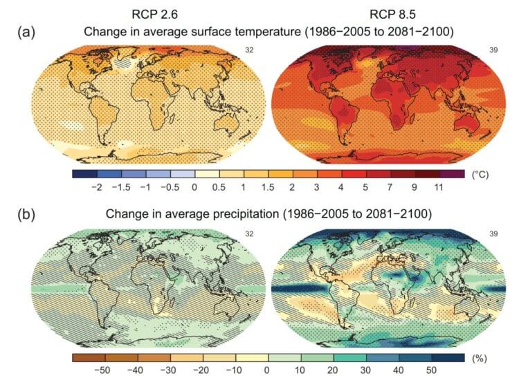 В свою очередь, сохранение потепления ниже целевого показателя потребует от мира придерживаться одного из более оптимистичных сценариев RCP, называемого RCP2.6. Это – достижимая цель, но только в том случае, если все страны, подписавшие Парижское соглашение по климату начнут снижать выбросы парниковых газов прямо сейчас (ну, технически мы должны были начать в 2020 году). При более промежуточном сценарии, называемом RCP4.5, выбросы начинают снижаться в 2045 году. Это позволит сдержать рост средней температуры между 1,5°C – 3°C градусами.