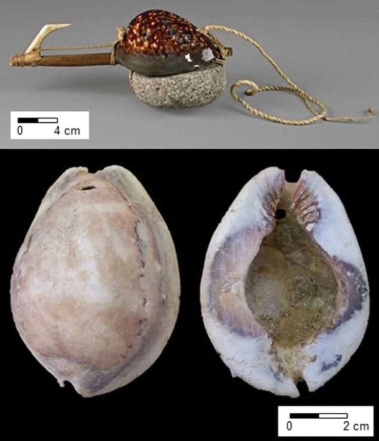 Недавно исследователям из США и Австралии удалось найти очень необычную приманку. По их расчетам, эти приспособления использовались в 1500–1100 годах до нашей эры жителями Марианских островов, которые располагаются в Тихом океане. Они представляют собой просверленные кусочки раковин, которые принадлежат каури — морским брюхоногим созданиям. Эти раковины располагались поверх рифленых каменных грузил. Считается, что древние рыбаки опускали эту конструкцию под воду на веревочке — под воздействием течения эти раковины «играли» и привлекали внимание добычи. Считается, что эта приманка использовалась для ловли осьминогов, потому что они как раз любят моллюсков каури. После того, как осьминоги выходили на поверхность, люди забивали их копьями или же ловили при помощи сетей. Не исключено, что иногда они просто вылавливали их руками.