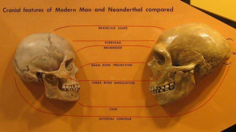 Череп современного человека (слева) и неандертальца (справа)