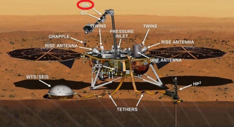 Конструкция модуля InSight. Роботизированная рука IDA выделена красным цветом