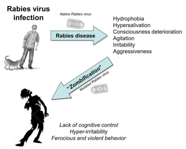 Вирус бешенства, как и подавляющее большинство других патологических микроорганизмов, пытается закрепиться с помощью общих и специфичных для хозяина механизмов, которые в конечном итоге придают вирусу эпидемиологическую пластичность. Результаты работы, посвященной возможным мутациям бешенства также рисуют мрачную картину – симуляция воображаемой вспышки зомби показывает, что большая часть населения США превратится в агрессивных монстров в течение одной недели с момента первого случая.