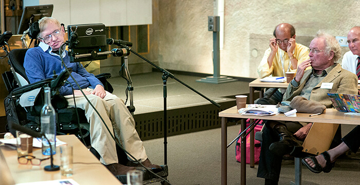 Стивен Хокинг выступает с докладом на собрании ведущих физиков мира в Королевском технологическом институте, 2015 год.