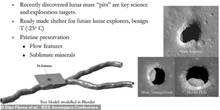 План лавовой трубки на Луне (справа) и вход в лавовую трубу (слева)