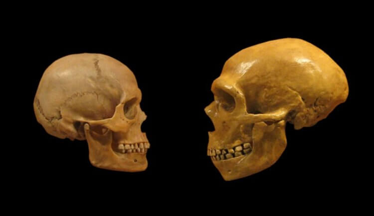 Череп современного человека (слева) и неандертальца (справа)