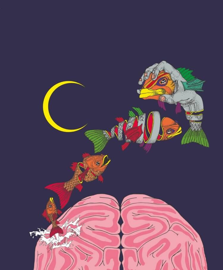 Эта иллюстрация представляет гипотезу о перенапряженном мозге, согласно которой редкие и галлюцинаторные качества сновидений – это не ошибка, а особенность, поскольку она помогает предотвратить перенапряжение мозга.