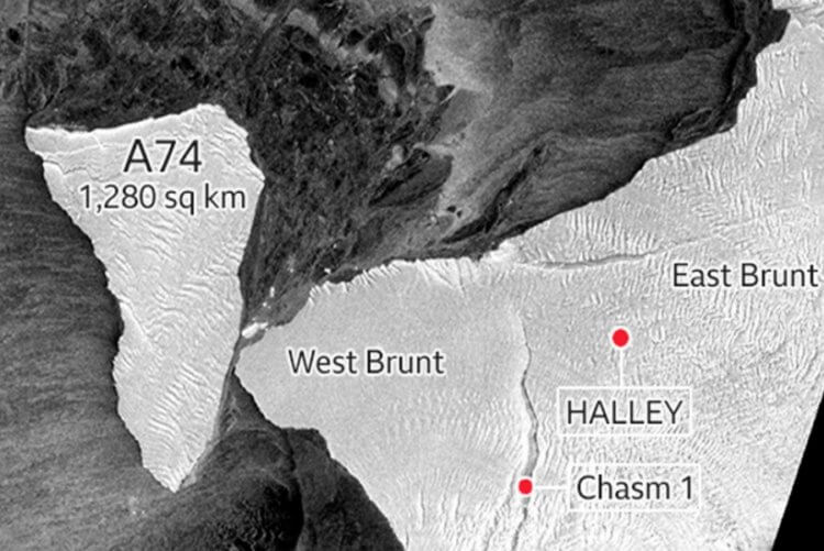 На днях А74 приковал к себе внимание ученых, так как направился в сторону материкового шельфа, от которого и откололся. За этим процессом особенно пристально наблюдали британские ученые, так как на шельфовом леднике Бранта расположена их исследовательская лаборатория, правда, законсервированная. Кроме того, ученых настораживал тот факт, что шельфовый ледник имеет огромную трещину, которая получила название Chasm 1. Соответственно, удар мог спровоцировать откол льда.