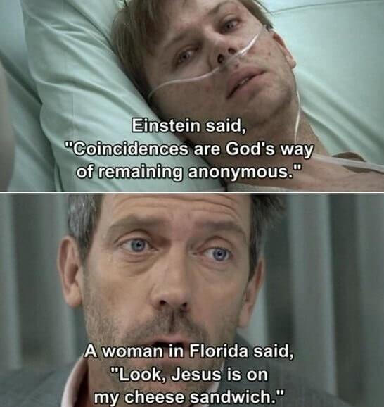 «Эйнштейн сказал что совпадения – это способ Бога остаться незамеченным». «Женщина из Флориды сказала: «Смотри, на моем сэндвиче лик Иисуса!» Кадр из сериала «Доктор Хаус».
