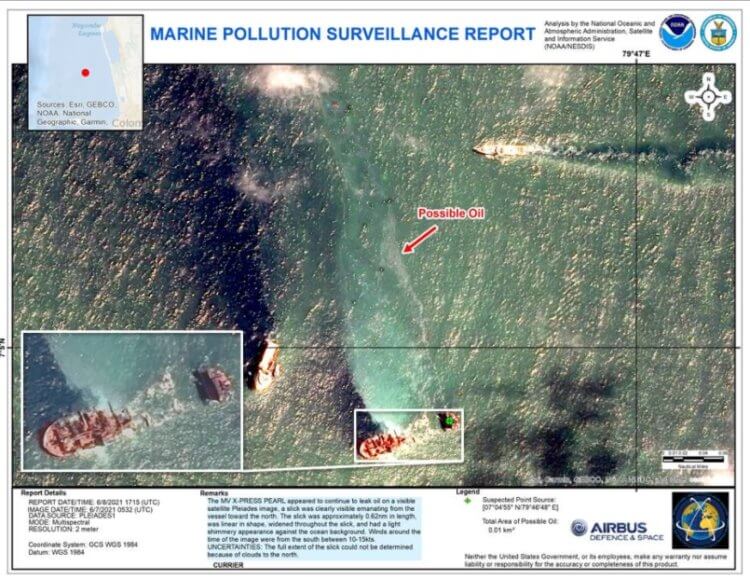 Ученые считают, что авария стала причиной отравления всей водной поверхности западной части Шри-Ланки. Есть причины предполагать, что помимо различных кислот и топлива, в воду попала и нефть. Издание Mongabay сообщает, что ученые пришли к такому выводу в ходе изучения спутниковых снимков. На всякий случай Управление по защите морской среды (MEPA) уже активировало план действий в случае разлива нефти. Вокруг взорвавшегося судна и наиболее подверженных опасности регионов уже установлены барьеры. Таким способом защитники природы хотят предотвратить попадание нефти на пляжи. Также некоторые службы отправлены на очистку уже загрязненных береговых линий.