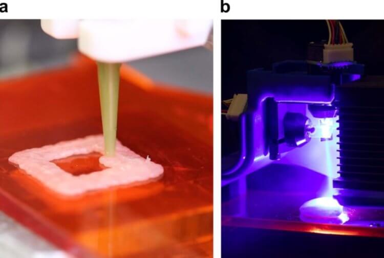 На рисунке a показана напечатанная на 3D-принтере структура из куриного мяса. На рисунке b это мясо разогревается при помощи лазера