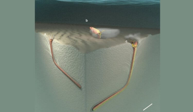 Около 400 миллионов лет назад на нашей планете жили хищные морские черви, которые достигали 2-метровой длины. Об этом, по крайней мере, свидетельствуют огромные норы, которые были найдены у берегов нынешнего Тайваня. Так как тела червей в основном состоят из мягких тканей, к сегодняшнему дню останки древних чудовищ полностью разложились и исчезли. Но даже исходя из формы норок и текстур на их стенках ученые могут рассказать о них много чего интересного. Уже совершенно точно известно, что гигантские черви были хищниками и питались мелкими рыбами. Свои огромные тела они прятали под землей, а снаружи показывали лишь маленькую часть рта. Когда над ними проплывали потенциальные жертвы, черви быстро хватали их и на время зарывались полностью. Похоже на описание монстра из фильмов ужасов, но такие создания действительно существовали. И существуют до сих пор…