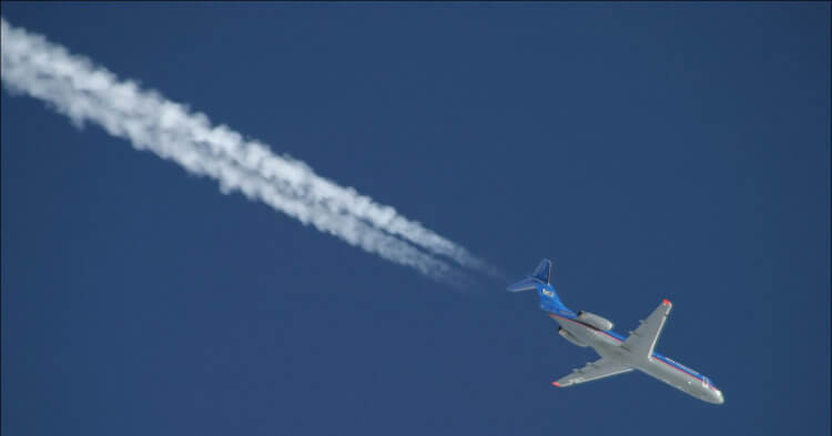 Задумывались ли вы когда-нибудь почему в небе после реактивного самолета остается белая “лыжня”, которая красиво смотрится на фоне синего неба? Все мы наблюдали за тем, как она долго держится, а потом медленно расходится. На самом деле мы видим в небе лед. Он возникает в результате того, что холодная атмосфера встречается с влажным и горячим выхлопом самолета. Вода в результате сразу же превращается в мелкие кристаллики.