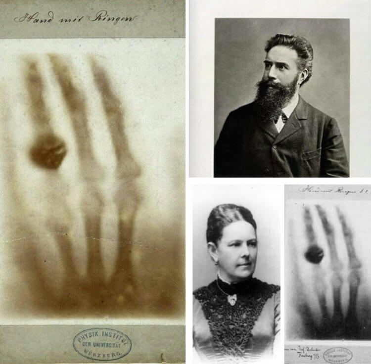 Портрет Вильгельма Рентгена, его жены Анны Берты Людвиг и рентген ее руки.