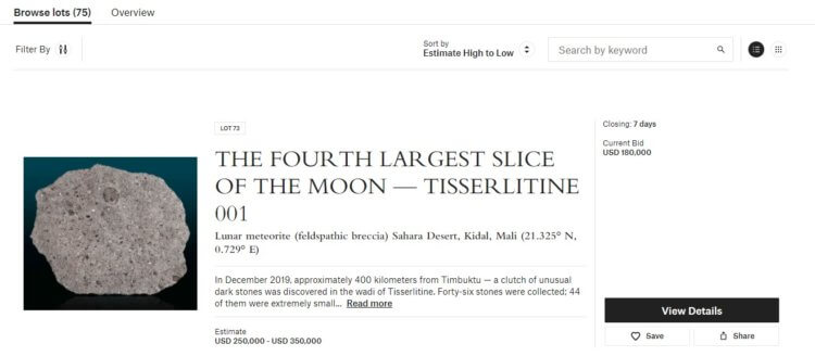 Самый дорогой метеорит, который выставлен на аукцион, был обнаружен в пустыне Сахара в декабре 2019 года. По мнению исследователей, он состоит из множества минералов вроде анортита, оливина и авгита. Считается, что этот камень улетел с поверхности Луны после падения астероида. Масса лунного метеорита равна 40 килограммам. Организаторы аукциона уверяют, что это второй по величие фрагмент Луны, который когда-либо оказывался на Земле. Ранее большие лунные камни прибывали на нашу планету вместе с экипажем космических миссий «Аполлон». Но даже они не могли сравниться по размерам с этим экспонатом. Перед выставкой передняя поверхность метеорита была отполирована. Он оценивается в 350 000 долларов.