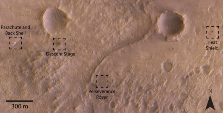 Марсоход Perseverance расположен на нижней части снимка, ближе к середине. Если между ним и парашютом провести линию, ближе к середине можно заметить что-то вроде небольшого холма у одного из кратеров. Это спускаемая ступень аппарата. А на верхней части справа есть небольшая черная точка, которая является тепловым экраном. Если бы не он, во время прохождения через атмосферу, марсоход мог сгореть или, как минимум, повредиться. Все эти объекты выделены на изображении ниже.