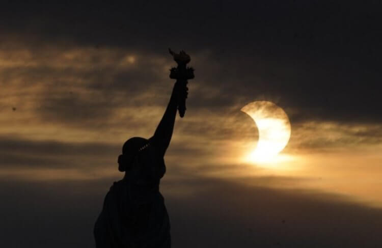 Один из самых красивых снимков удалось сделать фотографу Энтони Квинтаро — он заснял, как затемненное солнце восходит за статуей Свободы в Нью-Йорке.