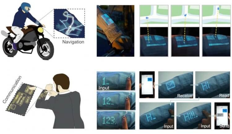 Чтобы выводить информацию на созданный фрагмент ткани, можно подключить к нему клавиатуру — видимо, материал уже соединен с небольшим компьютером. Также можно добавить Bluetooth-модуль, при помощи которого ткань синхронизируется со смартфоном и выводит уведомления о новых сообщениях. Если оснастить ткань чувствительными к нажатиям нитками, ответ на эти сообщения можно будет писать просто нажимая на виртуальную клавиатуру, выведенной на одежду. Звучит круто и было бы забавно видеть людей с такими футболками на улице. Можно сказать, что это неплохая альтернатива «умным часам», хоть и непривычная.
