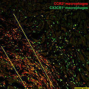 Снимок клеток сердца под электронным микроскопом: иммунные клетки (обозначены красным и зеленым цветом) стекаются в поврежденную область поврежденного сердца мыши через три дня после того, как исследователи ввели стволовые клетки сердца (область введения обозначена желтым)