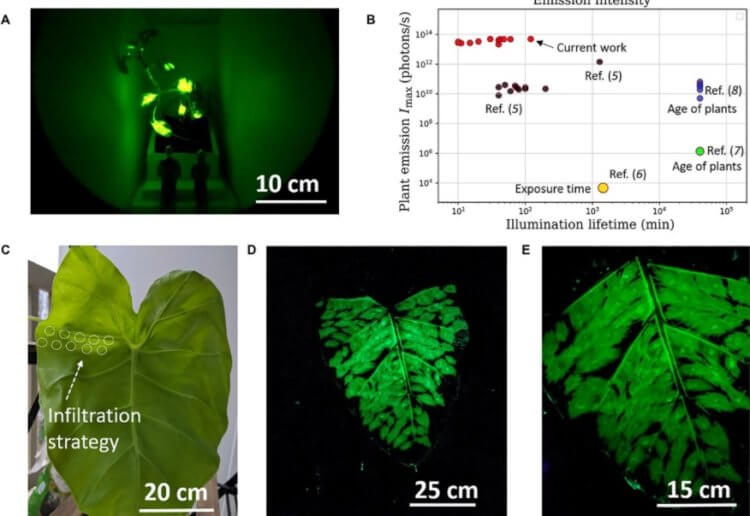 В ходе экспериментов было выяснено, что пленка из алюмината стронция способна «заряжаться» светом как от солнца, так и светодиодной лампы. Ученые поставили растение под синий светодиод на 10 секунд и листья зарядились настолько, что испускали свет обратно на протяжении почти одного часа. Сообщается, что потом исследователи пробовали менять концентрацию светящегося вещества и время пребывания под лампой и добились лучшего результата. Постоянно подзаряжаясь, растение смогло выполнять функцию лампы на протяжении двух недель. После этого срока оно погибло, но ученым удалось извлечь из листьев 60% светящихся веществ и использовать их повторно на другом растении.