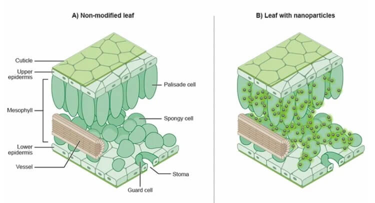 О новом поколении светящихся растений было рассказано в научном издании Science Alert. На этот раз в качестве светящегося вещества они использовали алюминат стронция, который поглощает свет и возвращает его в еще большем количестве. Вещество было внедрено в частицы диаметром в несколько сотен нанометров. Они, в свою очередь, были введены в листья через небольшие отверстия на их поверхности, которые именуются как устьица. Частицы накопились во внутреннем слое листьев и образовали собой тонкую пленку, которая не наносит вреда растению.