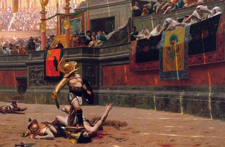 На арене Колизея проходили гладиаторские бои. Гладиаторами принято называть римских воинов, которые сражались между собой с целью развлечения публики. Как правило, боли заканчивались смертью одного из воинов. Победитель же имел хорошие шансы на освобождение от рабства, так что в победе каждый из них был крайне заинтересован. Только вот решить судьбу мог только царь — гладиатор мог убить соперника только если правитель опустит большой палец вниз. Помилование гладиаторов считалось позорным делом, поэтому убийства совершались часто.