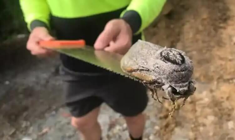 Самок вида Endoxyla cinereus нелегко встретить также потому, что после откладывания яиц они сразу же погибают. Цвет крыльев этих созданий варьируется от коричневого до темно-серого с различными узорами. На фотографии видно, что строителям удалось обнаружить узорчатую особь. Также эти создания очень редко встречаются потому, что обитают только в Австралии и Новой Зеландии, а также активничают только ночью. В стадии гусеницы эти создания еще более скрытные прячутся в стволах эвкалиптовых деревьев.