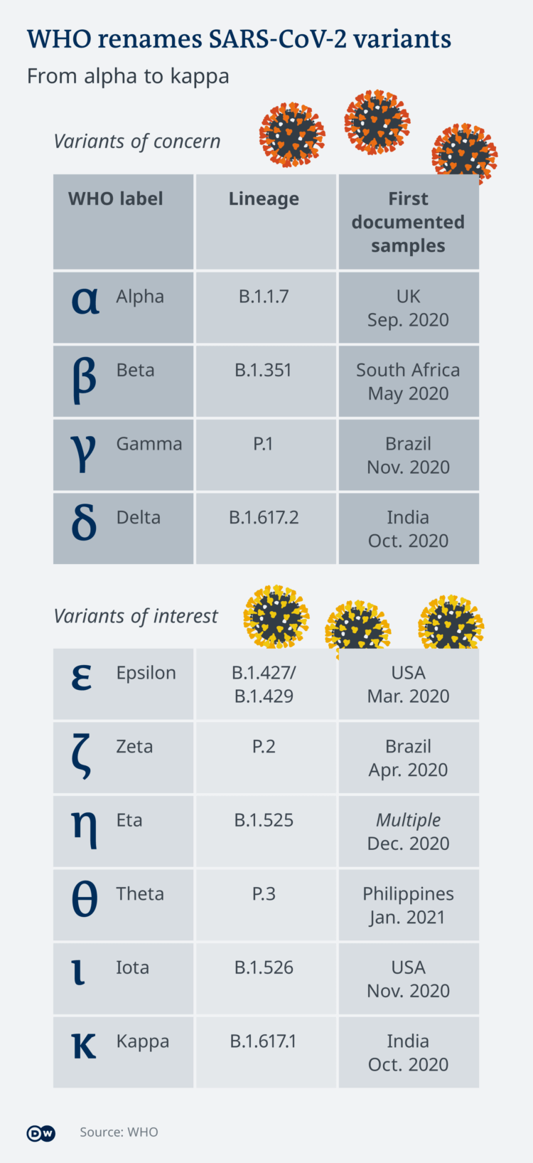До сих пор варианты, вызывающими беспокойство были названы в честь мест, где они были впервые обнаружены. Но, стремясь избежать стигматизации отдельных стран, Всемирная организация здравоохранения (ВОЗ) в настоящее время ввела новую систему наименований, основанную на буквах греческого алфавита. Британскому, кентскому, южноафриканскому, бразильскому и индийскому вариантам теперь будут присвоены буквы Альфа, Бета, Гамма и Дельта соответственно.