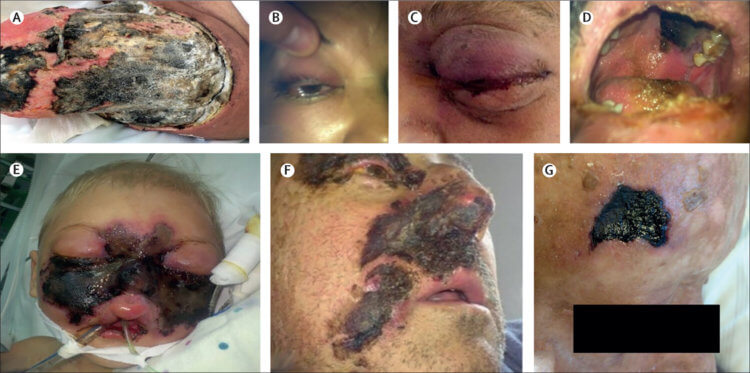 Симптомы мукормикоза зависят от того, где именно в организме растет грибок – в носовых пазухах, мозге, легких или коже. Так, к симптомам синусового и мозгового мукормикоза относят односторонний отек лица, головную боль, заложенность носа или носовых пазух, черные повреждения на переносице или верхней части рта, которые быстро становятся более выраженными и серьезными, а также лихорадка.