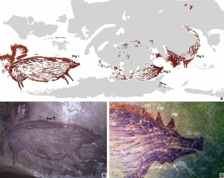 Одна из самых первых в истории человечества картин была нарисована около 73 тысяч лет назад. Она находится внутри африканской пещеры Бломбос и представляет собой хаотичные линии. Конечно, эти каракули трудно назвать произведением искусства, но это первое свидетельство того, что люди в какой-то момент времени научились рисовать на стенах пещер. С годами в пещерах начали появляться более осмысленные рисунки с сюжетом. Самым старым из них считалось изображение людей, которые охотятся на карликового быка аноа — возраст этого рисунка был оценен почти в 44 тысячи лет. Рисунок был найден внутри одной из пещер индонезийского острова Сулавеси. Но недавно в другой пещере этого же острова обнаружился более древний рисунок с изображением свиньи. Он нарисован в натуральную величину.