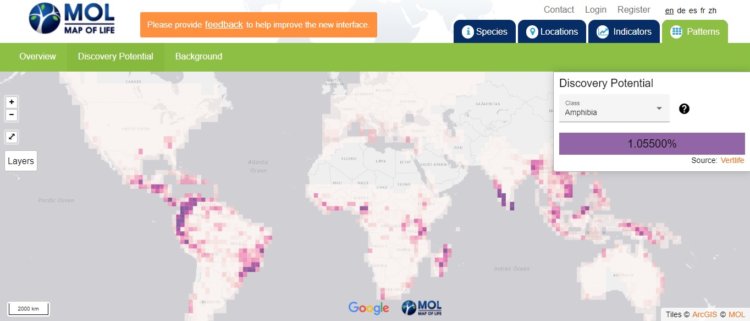 Карта с неоткрытыми животными доступна по этой ссылке. Обратите внимание на выпадающий справа список «Discovery Potential»: там можно выбрать амфибий (земноводные), рептилий (пресмыкающиеся), птиц и млекопитающих. Выберите одну из них и смотрите карту — чем темнее цвета клеток, тем больше шанс обнаружения новых видов животных выбранного класса. Например, если выбрать пункт Aves (птицы), карта предлагает искать их на территории южной Америки.