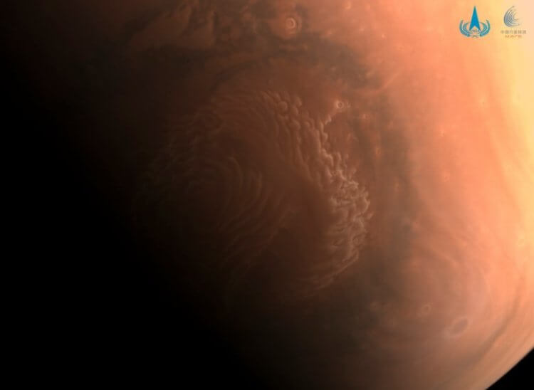 Помимо черно-белых снимков, станция «Тяньвэнь-1» отправила цветную фотографию. На ней запечатлена северная полярная шапка Марса.