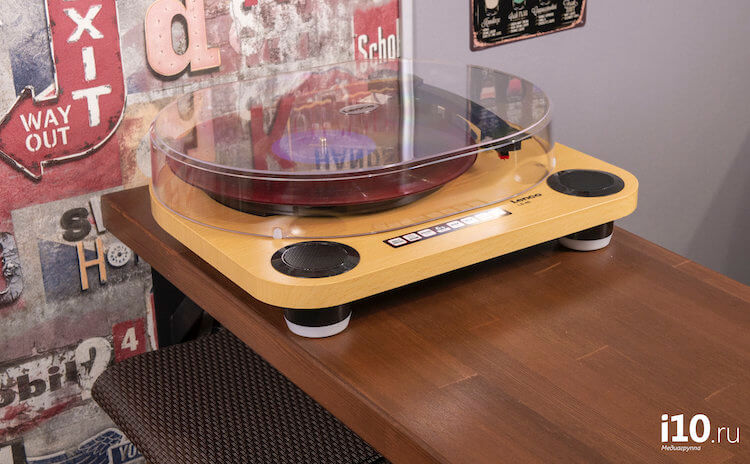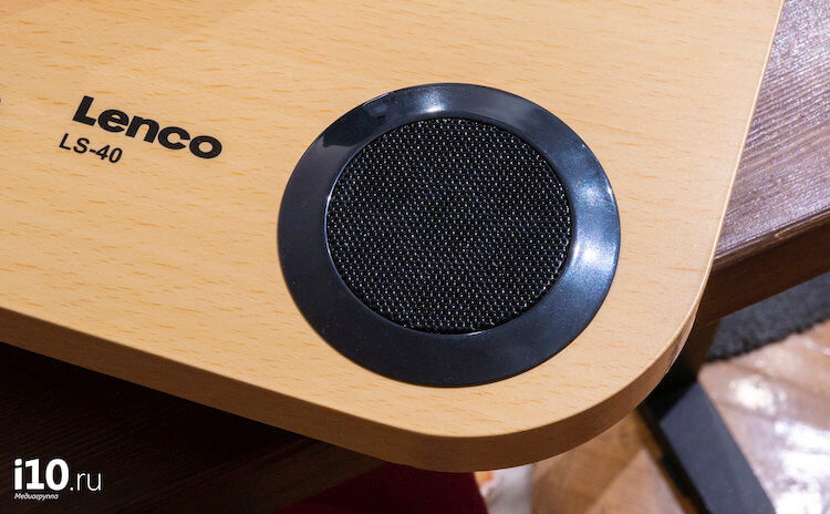 В конструкции предусмотрено два динамика, но я бы не стал на них слишком сильно рассчитывать. Они слишком маленькие и маломощные для прослушивания на хоть сколько-то большой громкости. Если проигрыватель будет стоять рядом с вами и что-то тихонько напевать, то они могут спасти, но лучше воспользоваться внешними колонками.