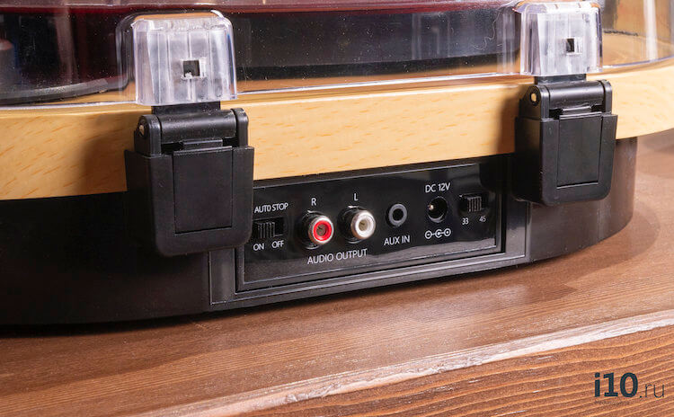 Подключить их можно только по проводу. РCA-разъем находится сзади, вместе с некоторыми остальными важными элементами. Среди них 3,5-миллиметровый AUX-вход для подключения внешних источников звука разъем питания и два тумблера — скорость вращения пластинки и выключения полуавтоматической функции остановки воспроизведения.