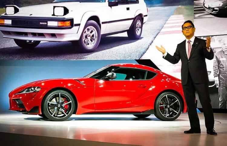 Глава Toyota Акио Тоеда (Akio Toyoda) на фоне изображения будущего автомобиля