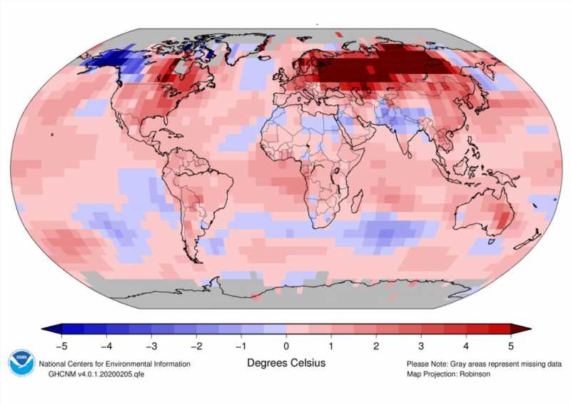 По данным Национального управления океанических и атмосферных исследований США (NOAA), январь 2020 года стал самым тёплым январём за 141 год наблюдений. Глобальные температуры поверхности суши и океана были на 1,14 градуса Цельсия выше среднего уровня всего XX века, побив предыдущий рекорд, установленный в январе 2016 года, на 0,02 градуса Цельсия.